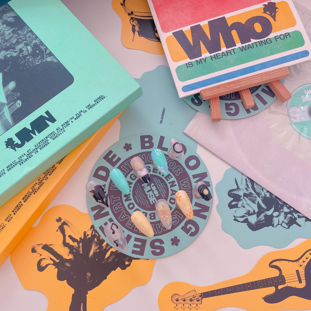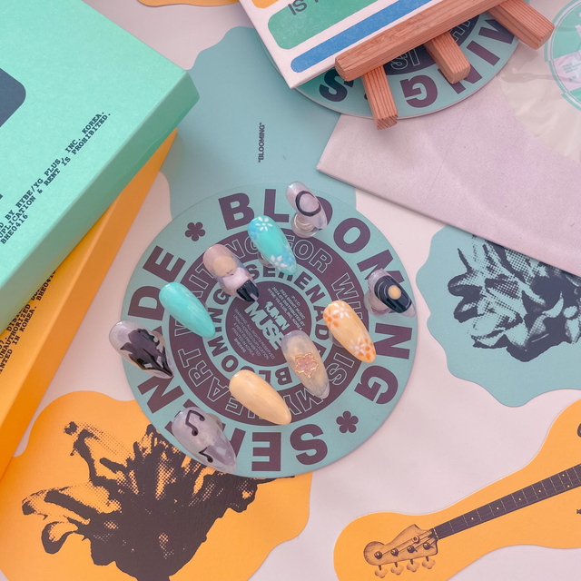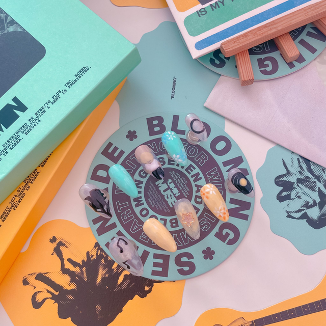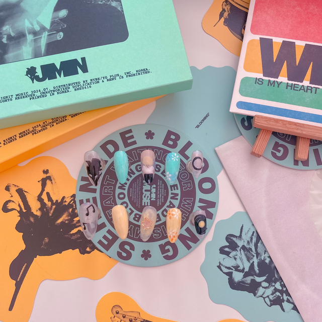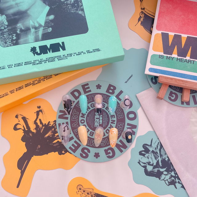 "Who is my heart waiting for?" 🎶 Laisse-toi emporter par la douceur et le mystère de l'album de Jimin avec ce set de press-on nails inspiré de son titre "Who". C'est un design unique qui mélange l'art, la poésie et les couleurs de l'album pour un look qui te ressemble :